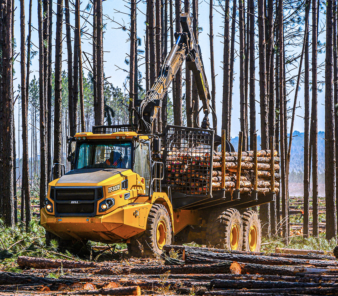 The Bell TF302E 6x6 WDB is a rugged and powerful timber crane tailored for demanding forestry operations. Powered by a 205 kW Mercedes-Benz engine, this machine features a 6x6 drive configuration, providing excellent traction and stability on tough terrain. The TF302E is equipped with wet disc brakes (WDB) for reliable stopping power in all conditions, reducing wear and ensuring maximum safety. The ergonomic cab includes advanced noise suppression, adjustable air-suspension seating, and enhanced visibility for operator comfort. With an efficient hydraulic system and heavy-duty suspension, this timber crane is built to maximize productivity and withstand the rigors of forestry work.